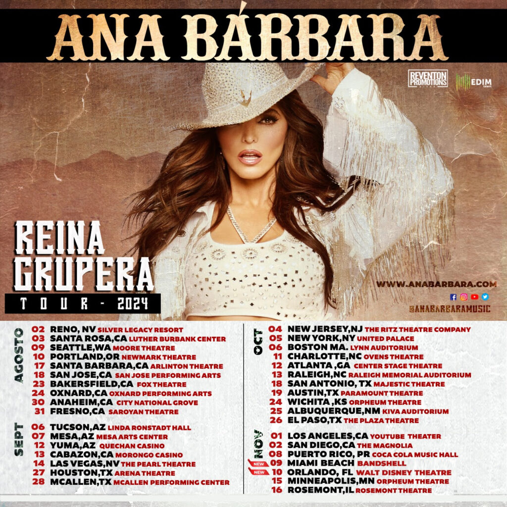 Además de este emocionante lanzamiento, Ana Bárbara continúa promocionando sus shows del «Reina Grupera Tour 2024», que dará inicio el 2 de agosto y concluirá el 16 de noviembre del mismo año, abarcando un total de 33 ciudades en los Estados Unidos. Desde Reno, Nevada, hasta Rosemont, Illinois, Ana Bárbara llevará su talento a lo largo y ancho del país, haciendo vibrar a sus seguidores con su inigualable estilo.