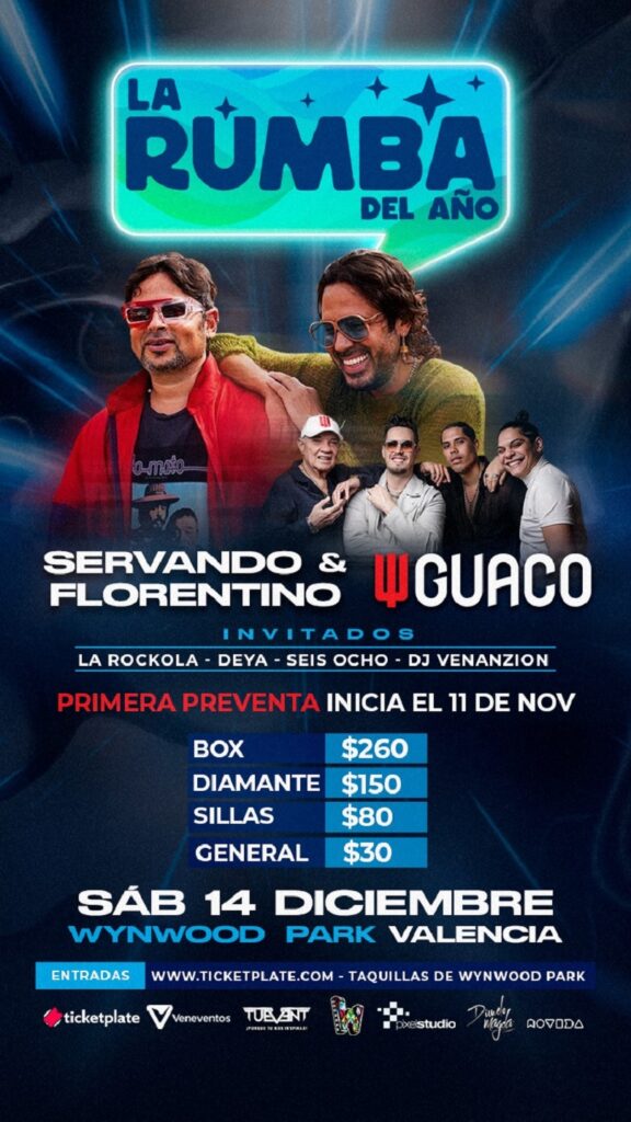 Las entradas para “La rumba del año” con Servando y Florentino junto a Guaco e invitados especiales estarán a la venta en primera etapa de preventa, a partir del 11 de noviembre, en www.ticketplate.com y las taquillas de Wynwood Park Valencia.